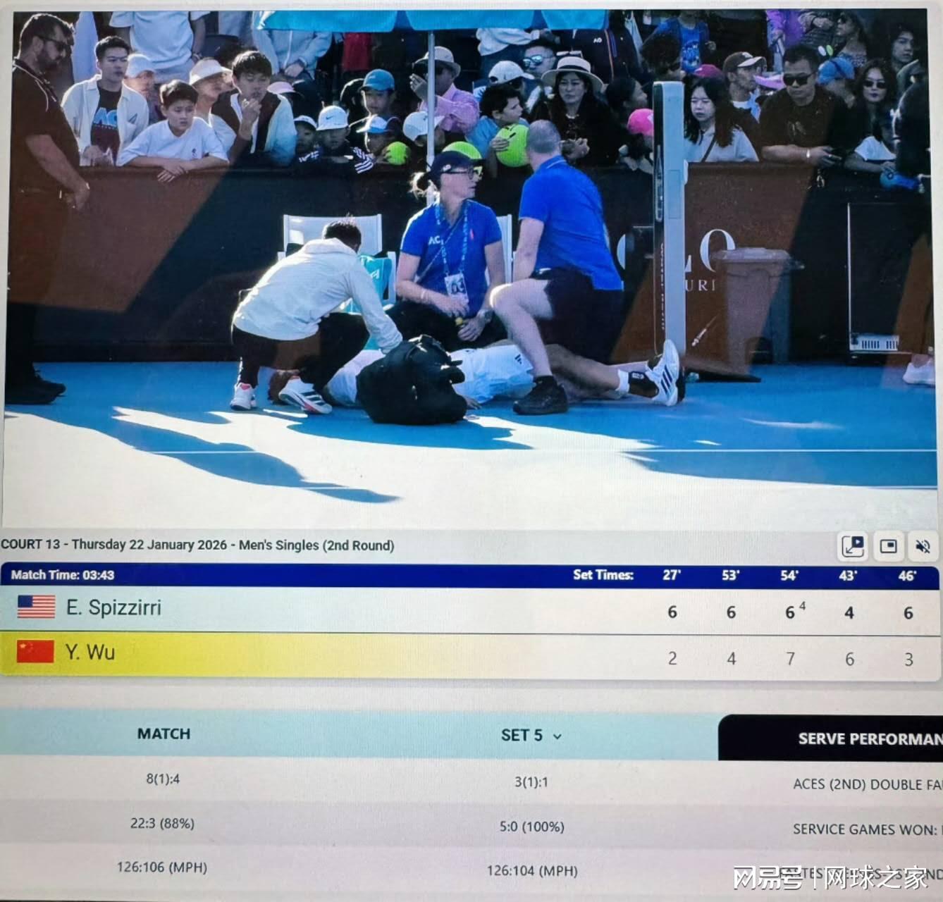 与此同时,在一场男子单打比赛中,中国选手吴易昺与斯皮泽里上演了五盘大战。在连续输掉前两盘后,吴易昺顽强反击,通过抢七赢下第三盘,又以6-4拿下第四盘,将比赛拖入决胜盘。决胜盘战至2-3,吴易昺的发球局40-40平分关键时刻,一个Ace球落地时,他感到腰部不适——腰好像有点撑到了,随后发出了双误。紧接着,他在落地时未能站稳,导致右腿开始抽筋,随后左腿和腹肌也接连抽筋,最终以3-6输掉决胜盘。